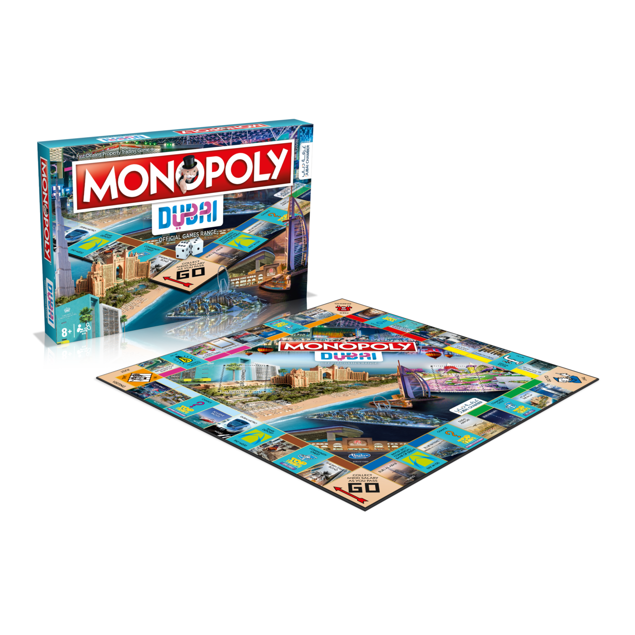 Utforska Dubai och dess sevärdheter när du reser runt MONOPOLY-planen! Börja din resa i den berömda Sheikh Zayed, och se upp för trafiklagar när du åker. Vägpirater åker direkt i fängelse! När du har njutit av utsikten från de mäktiga skyskraporna kan du bege dig till La Mer för att känna den varma sanden och brisen från Persiska viken. De som är sugna på en marin upplevelse bör bege sig till Atlantis Aquaventure, där det finns den ikoniska Dubai Frame med utsikt över stadscentrum. Slutligen kommer du till resans hjärta – det är dags att shoppa! Låt dig ryckas med i Festival City eller Mall of the Emirates. När du ger dig ut på shoppingrunda får du inte glömma att Dubai inte bara handlar om nöjen. Under din stadsrundtur kan du bjuda på världsberömda Nord Anglia International School och Global Village, som kombinerar högkultur med underhållning för hela familjen. Strax innan varvet är slut väntar Dubais största landmärken: det mäktiga Atlantis The Palm, världens högsta skyskrapa Burj Khalifa, den fantastiska Bluewaters Island och lyxhotellet – Burj Al Arab.